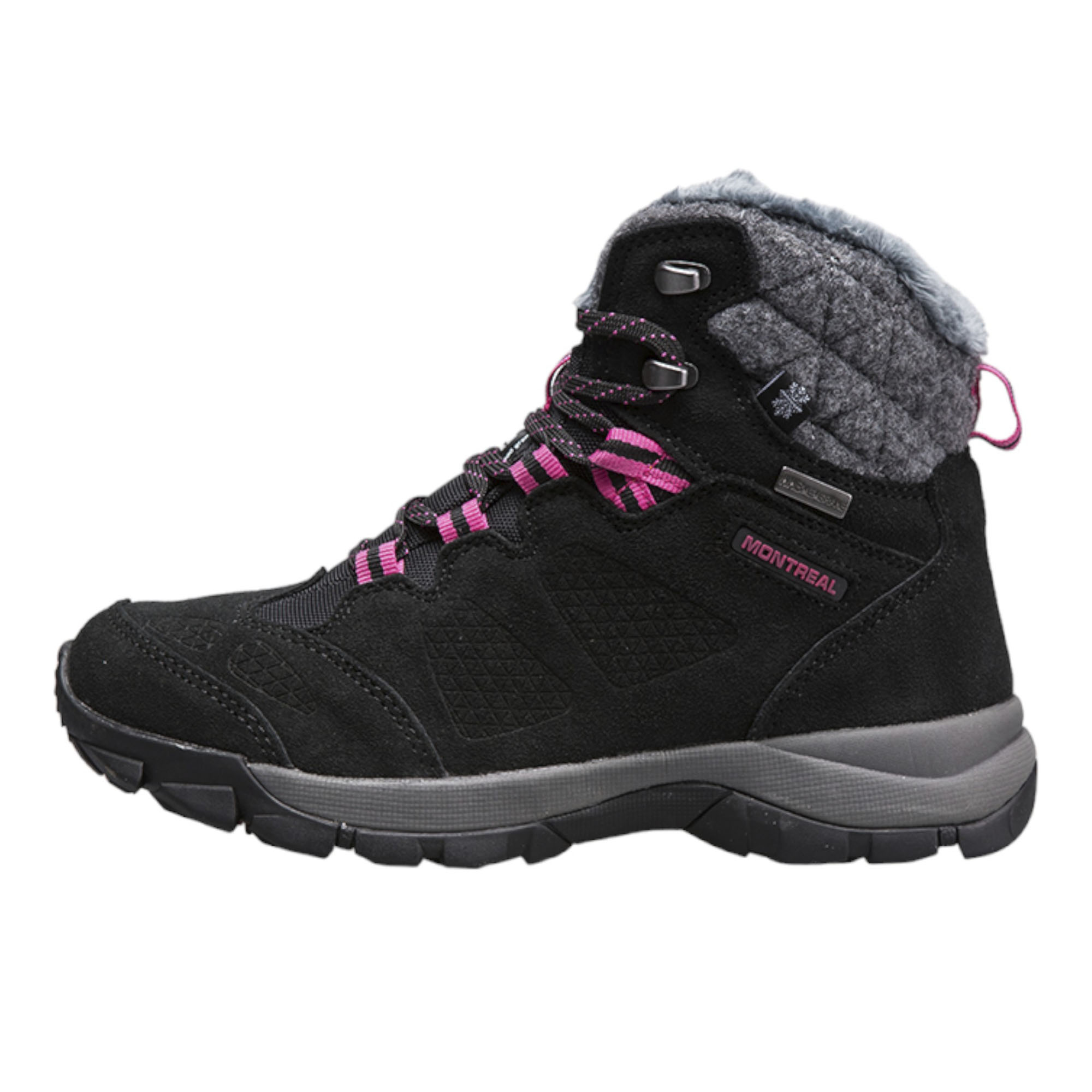 Сочетая стильный контрастный дизайн вместе с качественной сборкой и материалами ботинки Editex Montreal станут отличным выбором для любителей активного отдыха или просто для обычных пеших прогулок по городу. Внешний слой ботинок выполнен на основе износостойкой замши, что в сочетании с водоотталкивающей обработкой Durable Water Repellent (DWR) позволяет ботинкам выдерживать попадание влаги и мокрого снега при ходьбе. Для дополнительной защиты от попадания влаги изделие оборудовано мембранной, произведённой по технологии Waterproof Windproof Breathable (WWB), благодаря микроскопическим порам обеспечивается вентиляция внутреннего пространства ботинок, защищая ноги от попадания влаги извне с сохранение комфортного микроклимата. Современный утеплитель Thinsulate за счёт полиэфирных микроволокон эффективно удерживает тепло, термоизолируя ноги владельца и позволяет с комфортом носить обувь в широком температурном интервале. Валяная шерсть на голенище ботинок придаёт не только особый вид изделию, но также защищает голень от холода и ветра. Специальная колодка позволила создать максимально удобную обувь для женской ноги, что в сочетании с антимикробными съёмными стельками OrthoLite, защищающие от неприятного запаха и обеспечивающие дополнительную вентиляцию стопы, позволяет ощущать комфорт даже при суровых погодных условиях. Промежуточная подошва EVA эффективно распределяет нагрузку при ходьбе, делая пешую прогулку мягкой и комфортной. Подошва Ultra Slip Protection (USP) обладает высокой гибкостью и износостойкостью благодаря прочной резине с развитым рисунком протектора, что обеспечивает надёжное сцепление с рельефом. Прочная шнуровка с крепкими петлями создаёт надёжную посадку на ноге. Крепкие материалы с прошивкой из двойной строчки позволяют ботинкам выдерживать длительное ношение и множественную чистку с сохранением свойств и цвета. Контрастный дизайн чёрного цветового исполнения с яркими розовыми петлями позволяет обуви сочетаться как со спортивной, так и с повседневной одеждой.Характеристики: